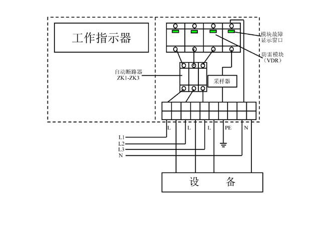 在正常工作電壓情況下,防雷模塊(VDR)處于高阻狀態(tài),不影響電路正常工作,指示燈亮。